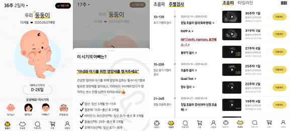또 앱내에서는 주 차별 상황에 맞는 아기, 엄마 , 아빠에게 유용한 정보와 임산부 필수 검사도 확인가능하다. 15주차 임신성 치은염이나 28주차 백일해와 같은 산모들이 임신 중 조심해야 할 질환에 대한 정보도 자세히 설명한다.