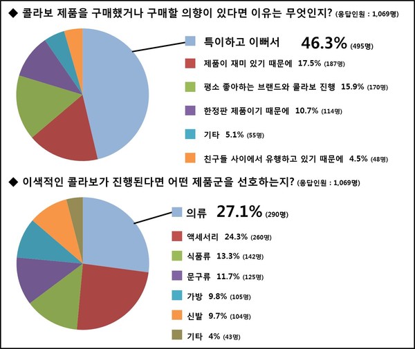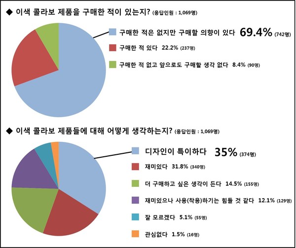 이들은 콜라보 제품에 대해 특이한 디자인(35%), 재미있다(31.8%)는 의견을 나타냈으며 단순히 실용성보다 특이하고 이쁘므로 구매하고 싶다(46.5%), 제품이 재미있다(17.5%), 평소 좋아하는 브랜드와 콜라보를 했다(15.9%), 한정판 제품이기 때문에(17.5%) 순으로 구매의향의 이유에 대해 답했다.
