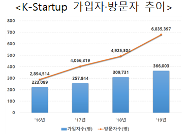 대한민국대표 창업지원 포털인 k-스타트업 사이트는 창업자를 위한 각종 창업 프로그램과 교육 기반시설 및 공간 등 창업 전 분야에 걸친 종합정보를 제공하는 곳으로 ‘15년부터 창업지원 정책의 통합 브랜드화를 진행해왔다. ’19년에는 가입자 37만 명, 방문자 680만 명까지 증가해 현재 국내 대표 창업 브랜드 사이트라 해도 과언이 아니다.