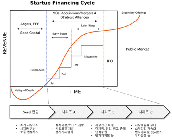 보통은 5억~20억 원 수준 사이의 규모로 이루어진다. 시드펀딩이 중요한 까닭은 이 돈을 가지고 초기 시장조사, 연구개발은 물론 초기인력 확보에 사용하기 때문이다.