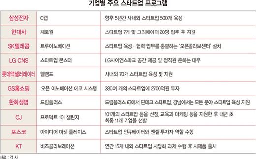 시대가 변함에 따라 대기업도 변화에 뒤처지지 않기위해 큰 노력을 하고 있다. 내부에서 아이디어를 공모해 사내벤처로 분사하거나 외부 스타트업 지원을 통해 파트너로 성장 후 인수 합병을 추진하기도 한다.