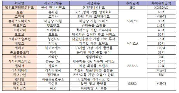 큐베이스바이오의 비임상 시험 서비스에 90억 원의 투자가 진행됐다. 반려동물 쇼핑몰 펫프렌즈도 145억 원 이라는 많은 투자를 유치하는데 성공했으며 독서모임 커뮤니티 서비스 트레바리도 40억 원의 투자를 유치했다.