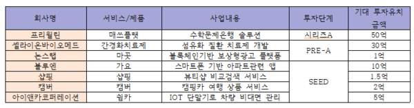 그 외에도 자동차 애프터마켓 플랫폼 라이더 대시와 피어나인의 메디링스, 가전제품 가격 비교 앱 메테인의 쉬운 쇼핑연구소, 학원 정보 플랫폼 파인듀, 치매예방 AI 피오 등이 시드 투자에 성공했다.