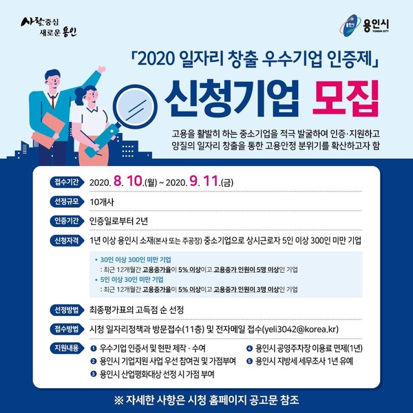 [더블유스타트업 이태영 기자] 경기 용인시가 10일부터 내달 11일까지 '20202년 일자리 창출 우수기업 인증' 을 희망하는 중소기업들의 선청을 받는다고 9일 밝혔다.