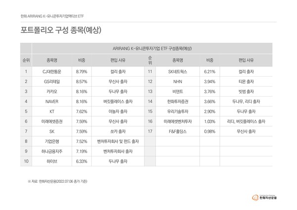 한화자산운용(대표이사 한두희)은 13일 ‘ARIRANG K-유니콘투자기업액티브 ETF’ (종목코드 : 436180)가 유가증권시장에 상장됐다고 밝혔다. 유니콘 기업이란 기업가치가 1조원 이상으로 평가되는 비상장 스타트업을 말한다.
