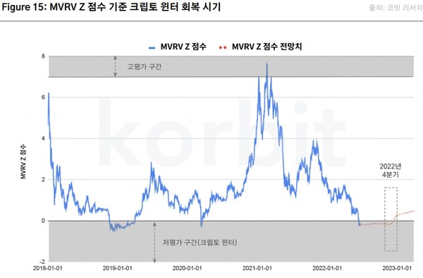 이를 기반으로 코빗 리서치센터는 비트코인 가치평가 방식 중 하나인 'MVRV Z' 점수를 통해 크립토 윈터를 MVRV Z 점수가 0.1 이하일 때로 정의했다. 코빗 리서치센터는 해당 기준으로 봤을 때 크립토 윈터가 그동안 네 번 발생했다고 진단했다. 2011년 9월8일에서 2012년 5월28일까지의 8개월이 첫번째 크립토 윈터였고, 2014년 10월3일~2015년 10월27일까지가 2차 침체기였다. 2018년 11월19일부터 2019년4월1일까지의 5개월이 3차 크립토 겨울이고, 올해 6월13일부터 4차 크립토 윈터가 시작된 것으로 코빗은 평가했다.