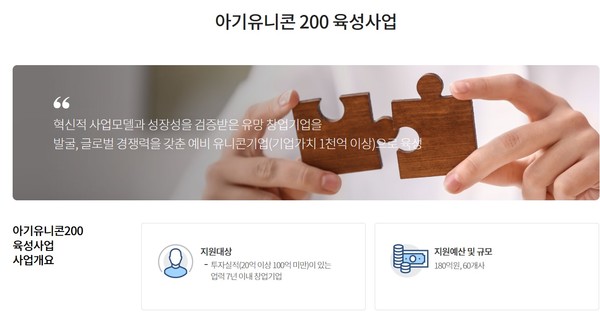 아기유니콘200 육성사업은 유망 창업기업을 발굴해 미래의 예비 유니콘기업(기업가치 1000억원 이상)으로 육성하기 위해 시장개척자금 등을 지원하는 사업을 말한다. 아기유니콘 기업이란 혁신적인 사업모델과 성장성을 검증받은 기업가치 1000억원 미만의 창업기업이다.