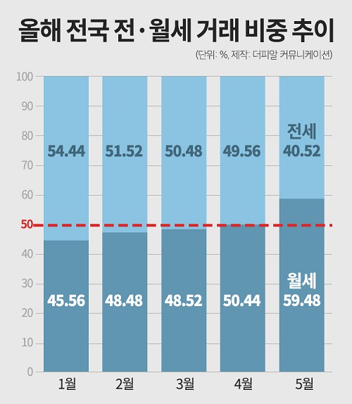 21일 국토교통부 주택 통계자료에 따르면, 전국 전월세 거래 중 월세 비중은 올해 1월 45.56%, 2월 48.48%, 3월 49.52% 등 꾸준히 오르다가 지난 4월 50.44%를 기록하며 관련 통계를 작성한 2011년 이후 처음으로 월세 거래량이 전세 거래량을 추월했다. 지난 5월 역시 59.48%로 급등하며 월세 거래량(24만321건)은 전월(13만295건) 대비 무려 84.44% 증가했다.