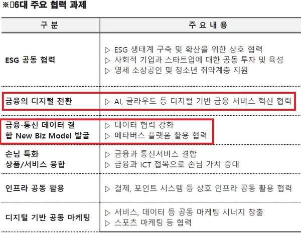 ‘손님 가치 혁신’이라는 공동의 목표 아래 양사는 ▲ESG 협력을 통한 사회적 역할 확대 ▲금융의 디지털 전환 ▲금융·통신 데이터 결합을 통한 새로운 비즈니스 모델 발굴 ▲손님 특화 상품·서비스 융합 ▲상호 인프라 공동 활용 ▲디지털 기반 공동 마케팅 등 6대 영역에서 금융과 ICT 융합 기반의 미래 협력 사업을 펼쳐나간다.
