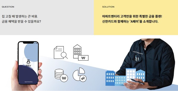 'A-페이'는 아파트멘터리와 리모델링, 인테리어 시공 계약을 맺은 고객들의 결제 부담을 덜어주기 위한 할부금융 상품이다.