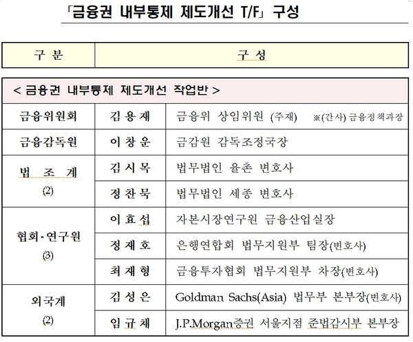 TF의 제도개선 작업반에는 김 상임위원 외에 이창운 금융감독원 감독조정국장, 김시목 법무법인 율촌 변호사, 정찬묵 법무법인 세종 변화사, 이효섭 자본시장연구원 금융산업실장, 정재호 은행연합회 법무지원부 팀장, 최재형 금융투자협회 법무지원부 차장, 김성은 골드만삭스 아시아 법무부 본부장, 임규채 JP모간증권 서울지점 준법감시부 본부장 등이 참여한다.