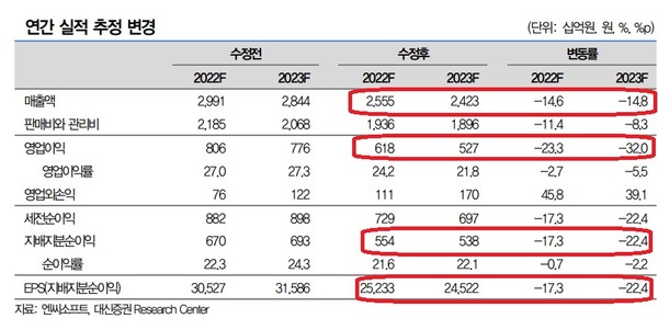 대신증권은 엔씨소프트의 올해 3분기 매출액을 5680억원으로 전기 대비 9.7% 줄어들 것으로 추정했다. 올해 연간 매출액은 2조5550억원으로 직전 전망치(2조9910억원) 대비 14.6% 낮춰잡았다. 영업이익과 지배지분순이익도 6180억원과 5540억원으로 종전 추정치 대비 각각 23.3%, 17.3% 하향조정했다.