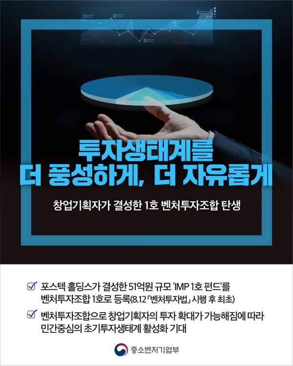창업기획자의 벤처투자조합 최소 결성금액이 완화되고, 벤처투자조합 출자자 수 산정기준이 대폭 완화된다. 벤처기업이 대규모기업집단에 인수되더라도 벤처투자조합 등의 지분 보유가 한시적으로 허용된다. 벤처투자조합의 결성과 회수가 활성화될 전망이다.