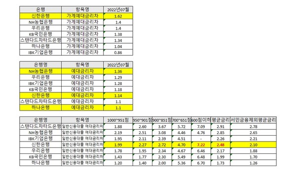 은행권의 예대금리차가 최초로 공개되면서 가계예대금리차가 가장 큰 신한은행이 주목을 받고 있다. 신한은행은 7월 중 고정금리 대출과 저신용자 대출을 늘리면서 가계예대금리차가 커졌다. 금리인상 기에 변동금리 대출보다 고정금리 대출을 늘리고, 저신용자 대상 대출을 늘렸는데 역으로 예대마진을 가장 챙겼다는 비난을 받는 역설에 처했다.