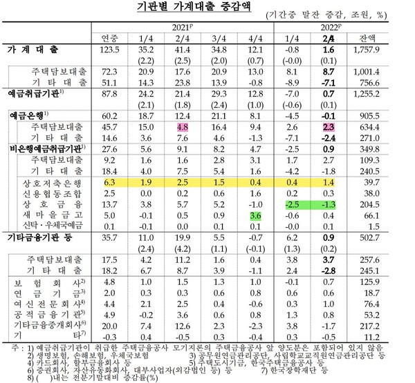 가계대출 가운데 주택담보대출은 대출잔액이 1001조4000억원으로 1분기보다 8조7000억원 늘어났다. 기타대출은 7조1000억원 감소했다. 신용대출을 포함한 기타대출은 지난해 4분기부터 3개 분기 연속 감소세다.