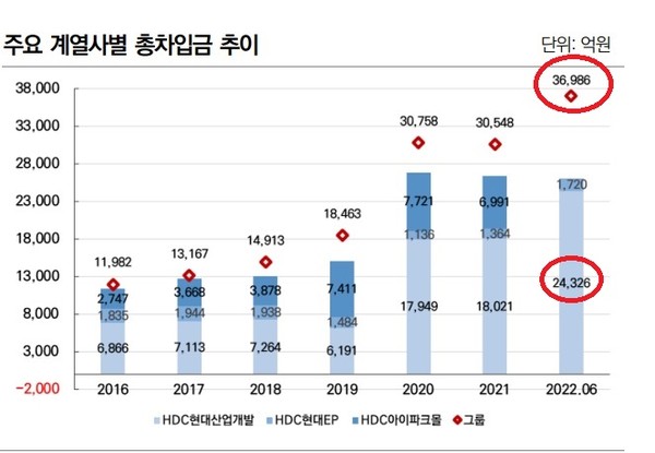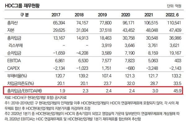 HDC그룹이 주력 기업인 HDC현대산업개발의 신용도 저하와 그룹 전반의 차입금 증가 리스크, 주택경기 위축에 따른 재무안정성 등 3가지 리스크에 직면한 것으로 평가됐다.