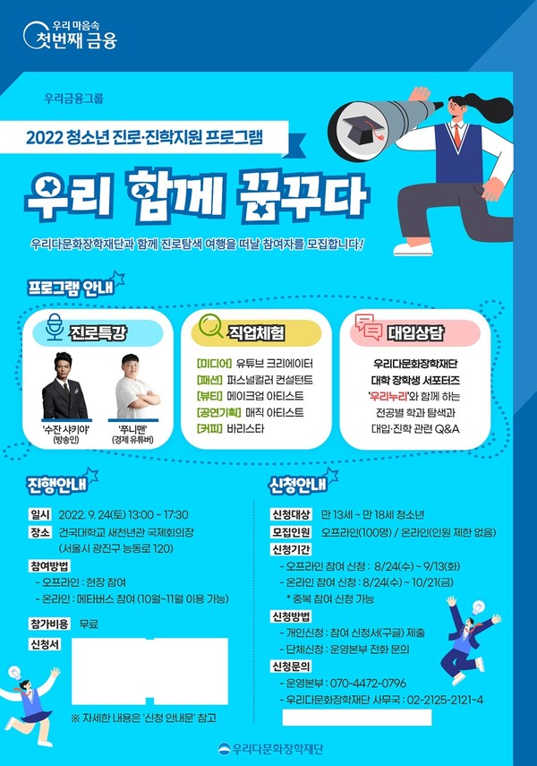 우리금융그룹 우리다문화장학재단(이사장 손태승)은 2022년 청소년 진로․진학지원 프로그램 「우리 함께 꿈꾸다」 참여자를 모집한다고 1일 밝혔다.