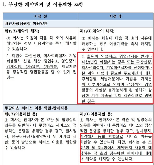 공정위는 "계약해지 사유를 구체화하고 제재조치 시 이의신청 또는 시정기회를 부여하도록 했다"고 약관 수정 배경을 설명했다.