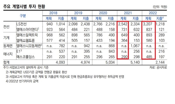 한국신용평가는 최근 발표한 LS그룹 분석보고서에서 "LS그룹의 과거 3개년 연평균 자본적지출(CAPEX)가 약 5000억원이었는데, 향후 5년동안 연간 약 1조원 이상의 추가 지출과 차입규모 증가가 예상된다"고 전망했다. 그러면서 "그룹 차원의 수익창출력 변화와 투자 진행 과정에서 발생하는 재무부담에 대한 모니터링이 필요하다"고 했다.