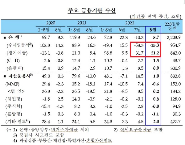 은행의 수신 잔액은 8월 말 현재 2208조9000억원으로 7월 말보다 8조7000억원 늘었다. 수시입출금식예금이 7월(-53조3000억원)에 이어 8월에도 15조3000억원 빠져나간 반면 정기예금은 7월(+31조7000억원)에 이어 8월에도 21조2000억원 불었다.