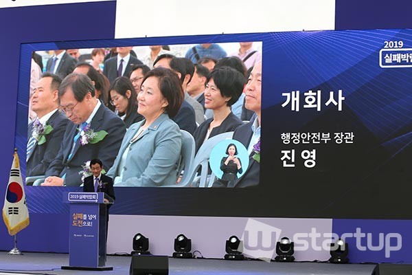 [더블유스타트업 김수진 기자] 진영 행정안전부 장관이 20일 오후 서울 종로구 광화문광장에서 진행된 2019년 실패박람회 개막식에서 개회사를 하고 있다.