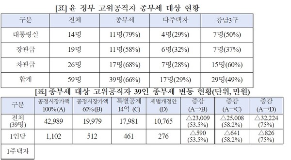대통령실은 14명 중 김대기 비서실장을 비롯한 11명(79%)이 종부세 대상이며, 강남3구에 7명(50%)이 주택을 보유하고 있다. 장차관급 고위관료는 45명 중 28명(62%)이 종부세 대상이며, 강남3구에 22명(49%)이 주택을 갖고 있는 것으로 나타났다. 종부세 대상인 39명의 주택 공시가를 모두 합하면 901억8702만원이 나온다. 1인당으로 환산하면 공시가 23억1249만원으로 시세로 치면 평균 30억이 넘는 주택을 보유하고 있는 셈이다.