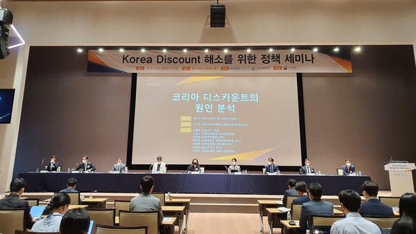 김준석 자본시장연구원 선임연구위원은 주제발표를 통해 "최근 10년 기준으로 우리나라 상장기업의 주가순자산비율(PBR)은 선진국의 52%, 신흥국의 58%, 아시아 태평양 국가의 69% 수준"이라고 코리아 디스카운트를 지적했다.