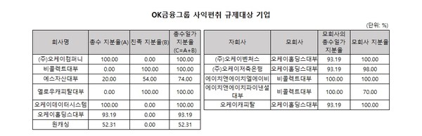 오케이금융그룹은 이번에 공시대상기업집단에 신규 지정되면서 최윤 회장이 100% 지분을 보유한 오케이데이터시스템, 오케이컴퍼니 등이 사익편취 규제대상에 포함됐다. 최윤 회장이 20% 이상 지분을 보유하고 있는 오케이홀딩스대부, 예스자산대부, 원캐싱 등도 사익편취 규제대상이다. 최윤 회장의 동생이 최대주주인 비콜렉트대부, 옐로우캐피탈대부 등도 일감 몰아주기 규제를 적용받는다. 오케이홀딩스대부의 자회사인 오케이벤처스, 오케이저축은행, 에이치앤에이치엘에이비, 에이치앤에이치파이낸셜대부, 오케이캐피탈 등도 새롭게 사익편취 규제 대상에 들어갔다.