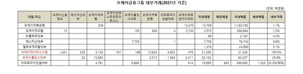 20일 공정거래위원회의 '2022년 공시대상기업집단 주식소유현황 보고서'에 따르면, 오케이데이터시스템은 지난해 국내 계열사를 통한 매출액이 213억2600만원으로 국내 매출액의 전부를 차지했다.