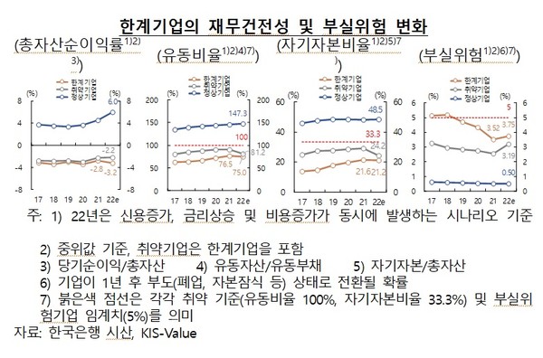 코로나19 발발 초기 중소기업과 서비스업을 중심으로 부실위험이 다소 높아졌지만, 지난해까지만 해도 기업부문 전반의 부실위험은 크게 낮아졌었다. 그러나 올해 들어 금리 상승에 따른 충격이 부실위험으로 전이될 수 있다는 것이다.