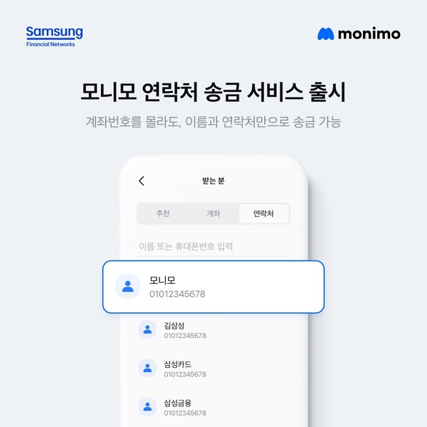 삼성카드는 삼성금융네트웍스 통합플랫폼 모니모에 이름과 연락처만으로 송금이 가능한 '연락처 송금' 서비스를 새롭게 출시했다고 26일 밝혔다.