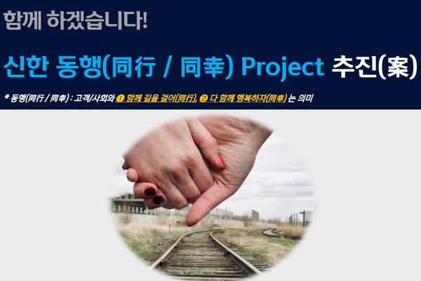 신한금융그룹(회장 조용병)은 29일 대한민국 대표 금융그룹으로서 사회적 책임을 다하고 ‘금융을 통한 선한 영향력’을 전하겠다는 의지를 담아 ‘신한 동행 (同行, 同幸) Project’를 추진한다고 밝혔다.