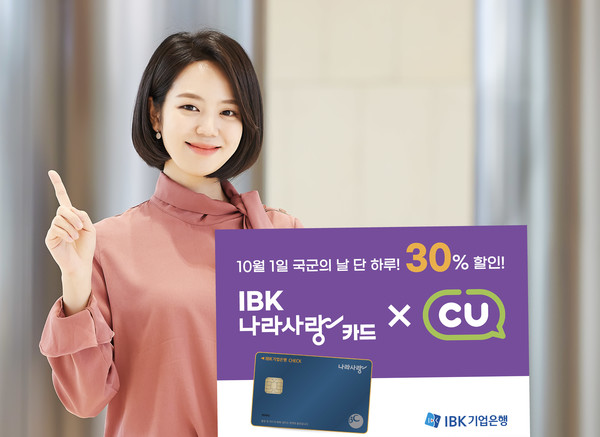 IBK기업은행(은행장 윤종원)은 국군의 날(10월 1일)을 날을 맞아 현역장병과 예비역들을 응원하고자 IBK나라사랑카드 제휴처인 CU와 함께 ‘국군의날 특별할인 이벤트’를 진행한다고 29일 밝혔다.