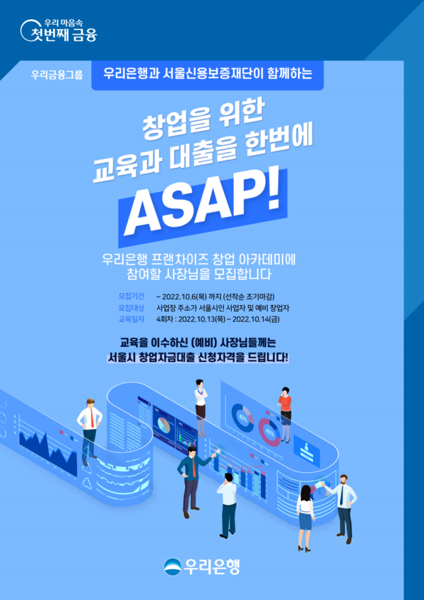 이번 '우리은행과 서울신용보증재단이 함께하는 소상공인 창업아카데미'는 올해 마지막으로 진행되는 회차다. 우리은행WON뱅킹, WON기업, 인터넷뱅킹, 모바일웹에서 10월 6일까지 참가 신청이 가능하다.