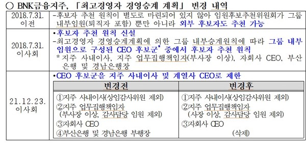 BNK금융지주의 '최고경영자 경영승계 계획'은 2018년 7월31일 이전에는 그룹 계열사 임원뿐만 아니라 외부 후보자도 추천이 가능했다.