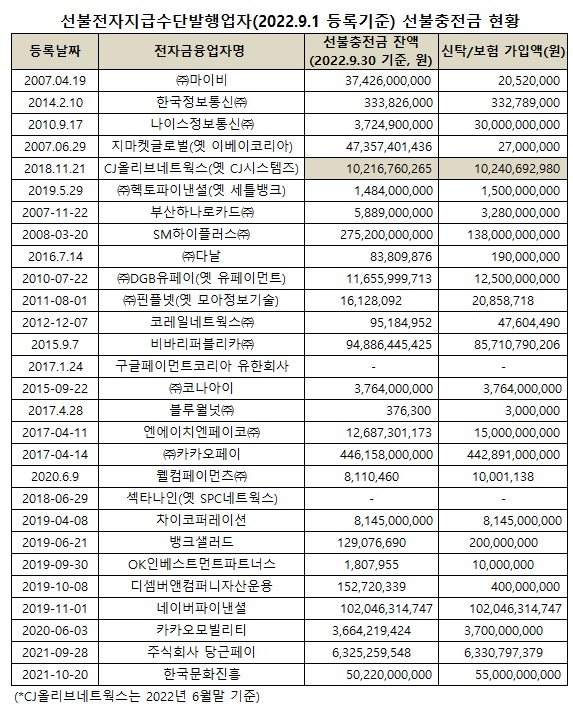 유한회사인 구글페이먼트코리아를 비롯해 SPC그룹의 결제회사인 섹타나인, 로드시스템, 핀샷, 비즈플레이, 센트비, 아이오로라, 유핀테크허브 등이 선불충전금 운용현황에 대한 공시를 하지 않고 있다.
