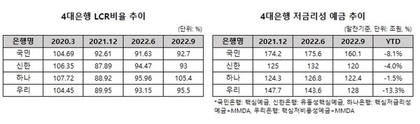 4대은행 LCR 92.5% 충족, 하나은행 105.4% 급등