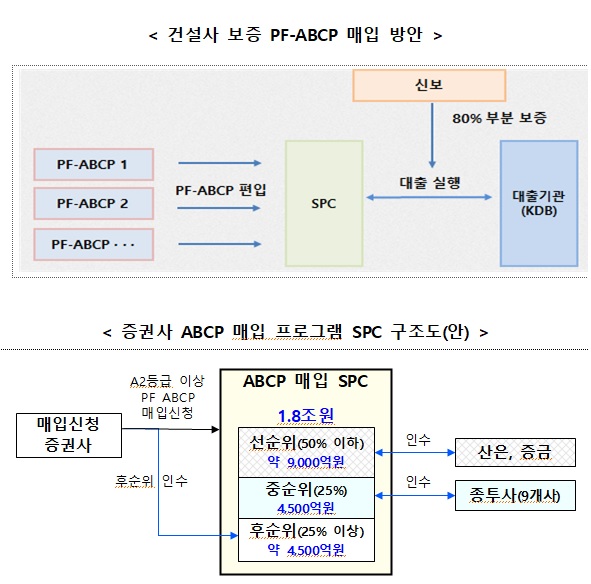 먼저 건설사 보증 PF-ABCP에 대해 산업은행·신용보증기금의 CP 매입 프로그램(A2 대상)을 활용해 1조원+α 규모로 지원하기로 했다. 산업은행이 별도 매입기구(SPC)를 설립해 건설사 보증 PF-ABCP를 매입하고, 신용보증기금은 매입금액의 80%를 보증할 예정이다.