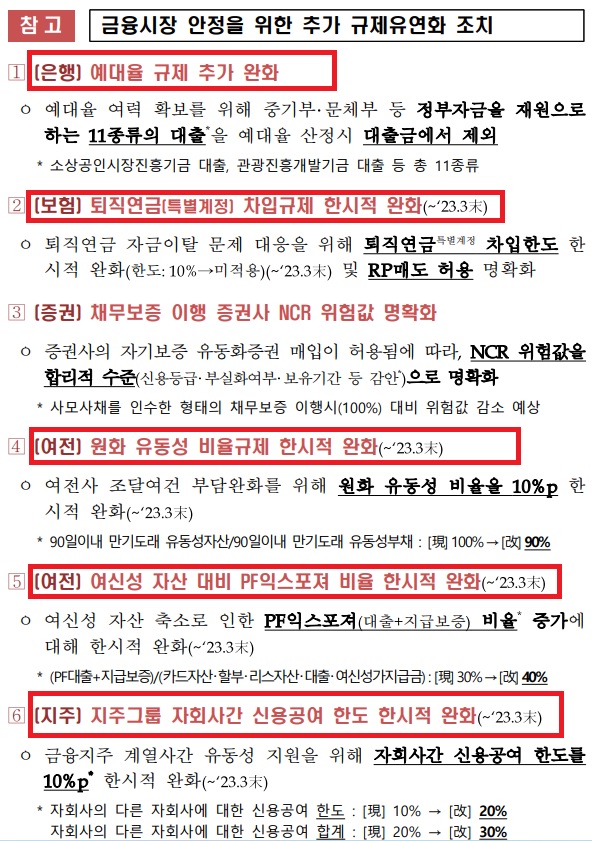 또 금융권의 유동성 공급을 지원하기 위해 소상공인시장진흥기금 대출과 관광진흥개발기금 대출 등 정부자금을 재원으로 하는 대출을 예대율 산정시 대출금에서 제외한다. 퇴직연금 자금이탈 문제를 대응하기 위해선 퇴직연금 특별계정의 차입한도를 내년 3월말까지 적용하지 않기로 했다. 여전사의 원화 유동성 비율규제도 한시적으로 완화해 내년 3월까지 유동성 비율 규제를 90%로 낮춘다. 여신전문금융회사의 PF 익스포져 비율도 한시적으로 40%로 낮추주기로 했다. 또한 금융지주 계열사 간 유동성 지원을 위해 자회사 간 신용공여 한도를 10%포인트 완화한다. 자회사의 다른 자회사에 대한 신용공여 한도는 현행 10%에서 20%로 완화되고, 자회사의 다른 자회사에 대한 신용공여 합계는 20%는 30%로 늘어난다.