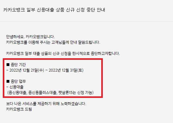 카카오뱅크는 지난해에도 10월부터 연말까지 고신용자 신용대출과 직장인 사잇돌대출, 전세대출의 신규대출을 중단했다. 지난해에는 금융당국의 가계대출 총량관리 차원에서 대출 한도를 조정하기 위한 조치였다. 또한 연말까지 중.저신용자 대출 비중 목표치를 달성하기 위한 전격적인 조치였다.