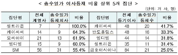 [이슈앤비즈 김현동 기자] 대규모기업집단 중 셀트리온그룹은 서정진 명예회장과 총수일가가 지배주주면서 등기이사로 전체 계열사 경영에 직접적으로 참여하고 있는 것으로 나타났다. KCC그룹과 OCI그룹, MDM, SM그룹 등도 총수일가의 경영권 참여 비중이 계열사 절반 이상에 달했다. KCC는 전체 등기이사 중 총수일가의 등재 비중이 가장 높기도 했다.