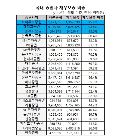 하이투자증권, 다올투자증권 등은 부동산PF 관련 채무보증 규모가 자본총계의 90% 이상을 차지해 지난해 단기금융시장 변동 과정에서 유동성에 어려움을 겪었다. 다올투자증권의 경우 매입확약 규모가 6460억원(지난해 9월말 기준)으로 자본총계의 93.0%에 달한다. 하이투자증권의 매입확약 역시 1조3577억원으로 자본총계의 95.4%에 달한다. 메리츠증권의 경우 매입확약 1조4981억원, 매입보장약정 9058억원 등 채무보증 규모가 5조243억원으로 자기자본(5조3798억원)의 93.4%에 이른다.