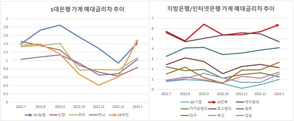 인터넷은행, 지방은행, 외국계 은행을 포함해 19개 은행 가운데 가계 예대금리차가 가장 큰 곳은 전북은행(6.40%포인트)이었다. 전북은행의 평균 예대금리차도 5.69%포인트로 토스뱅크(5.22%포인트)보다 높았다.