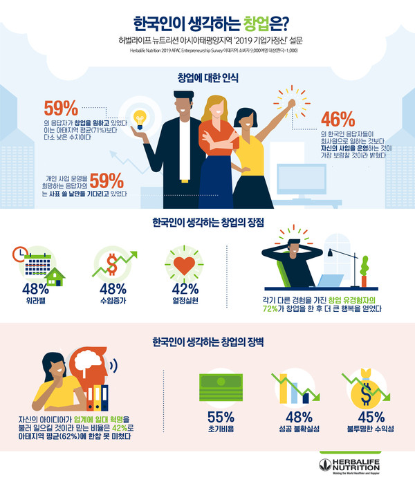 한국허벌라이프가 아시아태평양지역(이하 아태지역) 소비자 대상으로 진행한 ‘기업가 정신(entrepreneurship)’ 설문조사 결과, 한국인은 아태지역 평균에 비해 창업 의지가 낮으며 초기비용과 불투명한 수익성, 아이디어 부족 등의 이유로 창업에 보수적인 것으로 나타났다.