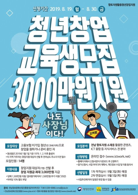 전남정보문화산업진흥원(원장 이준근)이 30일(금)까지 ‘향토자원 활용 청년창업 지원사업’ 운영에 따른 예비 청년 창업가(교육생)를 모집한다고 밝혔다.