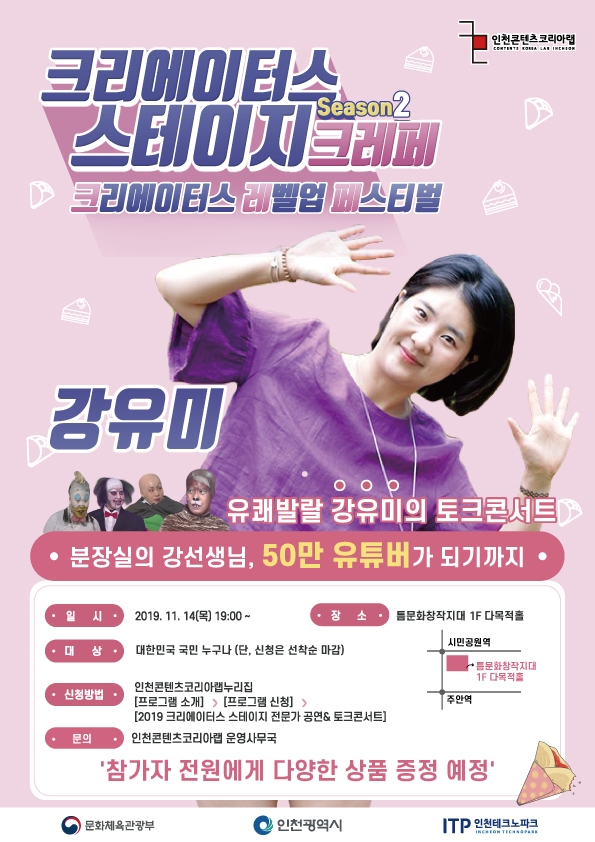 이번 강연에서 강유미는 인기 유튜버가 되기까지의 과정을 공개하고 창작자들과 공감하는 토크 콘서트를 이끌어갈 예정이다. 또한 SBS 판타스틱 듀오, 아이유편에 출연한 ‘마트보안관 남현섭’과 에일리와 같이 호흡을 맞춘 ‘한우총각 성한준’의 공연도 펼쳐진다.
