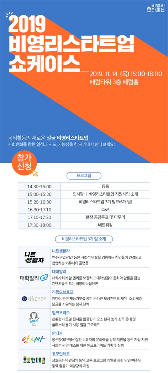 [더블유스타트업 김수진 기자]서울시 NPO지원센터(센터장 정란아)는 오는 11월 14일(목) 15시 을지로 페럼타워 페럼홀에서 ‘2019 비영리스타트업 쇼케이스’를 개최한다고 밝혔다.