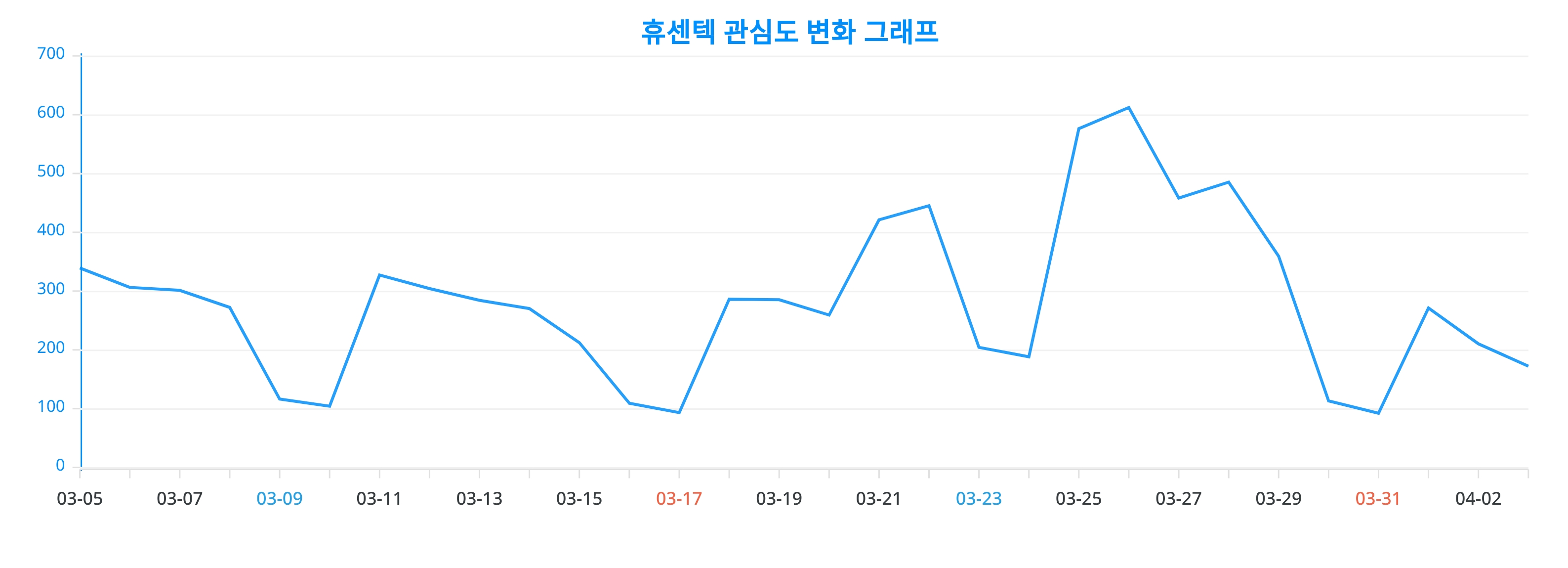 이번 분석을 통해 얻어진 휴센텍에 대한 일간 변화 추이 차트는, 휴센텍에 대한 관심이 어떻게 변화했는지를 생생하게 드러낸다.