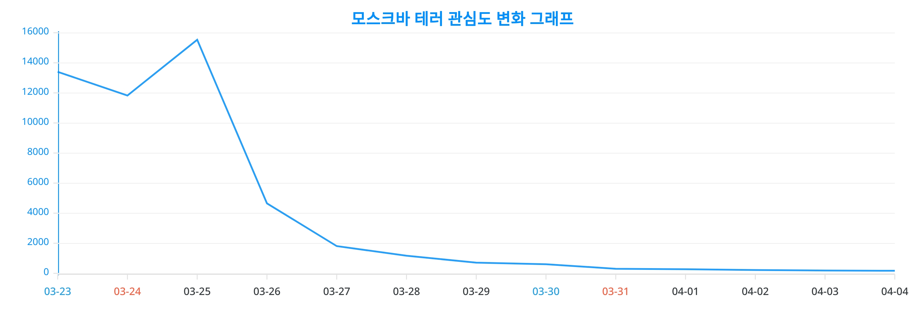이번 분석을 통해 얻어진 모스크바 테러에 대한 일간 변화 추이 차트는, 모스크바 테러에 대한 관심이 어떻게 변화했는지를 생생하게 드러낸다.
