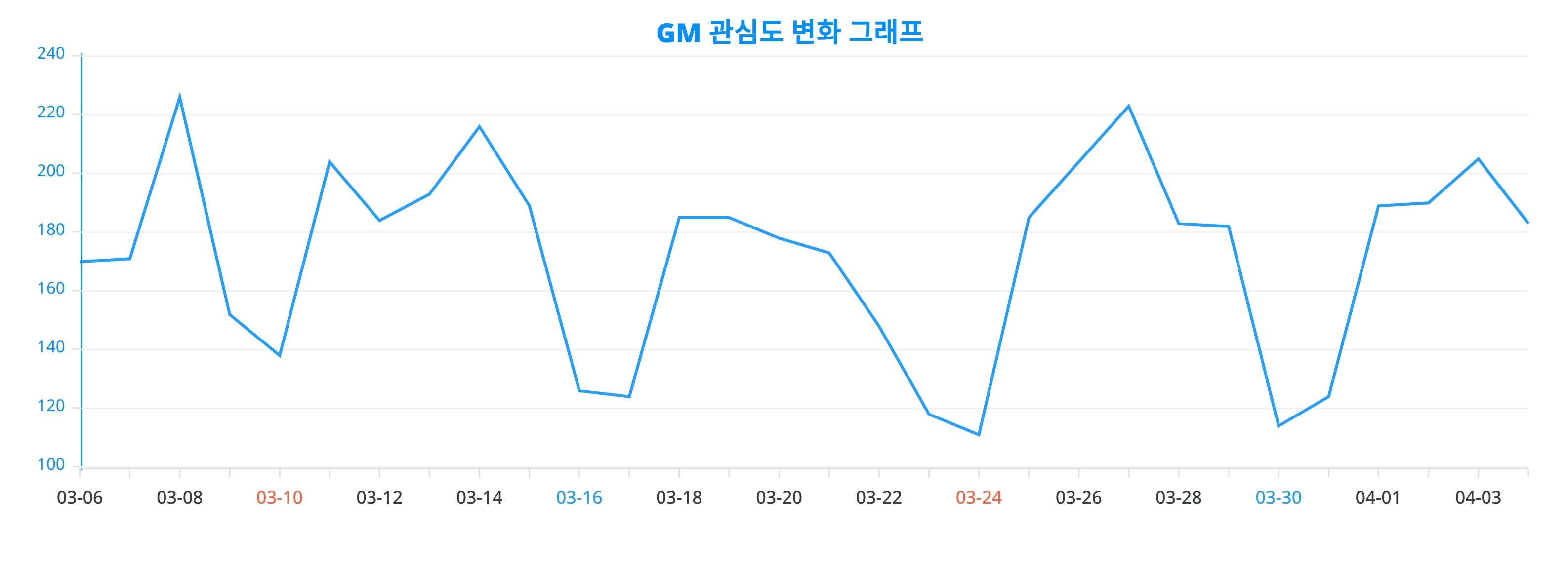 이번 분석을 통해 얻어진 GM에 대한 일간 변화 추이 차트는, GM에 대한 관심이 어떻게 변화했는지를 생생하게 드러낸다.